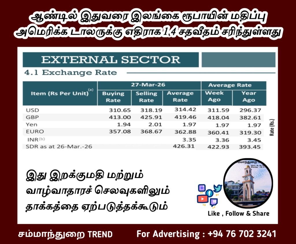 நாணய மாற்று விகிதங்களில் ஏற்பட்ட இந்த மாற்றம், நாட்டின் பொருளாதார சூழ்நிலையை பிரதிபலிப்பதுடன், இறக்குமதி செலவுகள் மற்றும் வாழ்வாதாரச் செலவுகளிலும் தாக்கத்தை ஏற்படுத்தக்கூடும் என பொருளாதார வட்டாரங்கள் குறிப்பிடுகின்றன.
