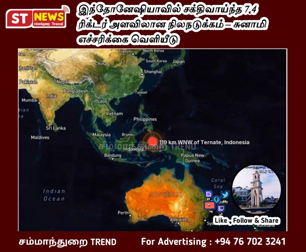 இந்தோனேஷியாவின் கிழக்கு பகுதியில் இன்று (வியாழக்கிழமை) அதிகாலை 7.4 ரிக்டர் அளவிலான சக்திவாய்ந்த நிலநடுக்கம் ஏற்பட்டுள்ளதாக சர்வதேச கண்காணிப்பு மையங்கள் தெரிவித்துள்ளன.