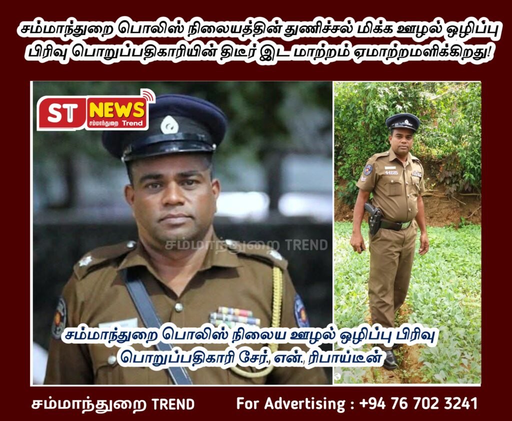 சம்மாந்துறை பொலிஸ் நிலைய ஊழல் ஒழிப்பு பிரிவு பொறுப்பதிகாரி என். ரிபாய்டீன் சேர் அவர்களின் திடீர் தற்காலிக இடமாற்றம், சம்மாந்துறை மக்களிடையே பெரும் ஏமாற்றத்தையும் அதிர்ச்சியையும் ஏற்படுத்தியுள்ளது.