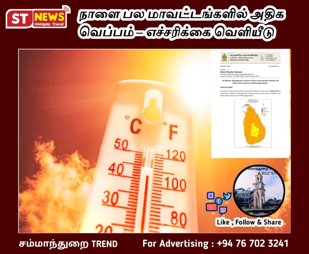 நாளை (ஏப்ரல் 03) நாட்டின் பல பகுதிகளில் அதிக வெப்பமான காலநிலை நிலவும் என வானிலை ஆய்வு திணைக்களம் எச்சரிக்கை அறிவிப்பு வெளியிட்டுள்ளது.