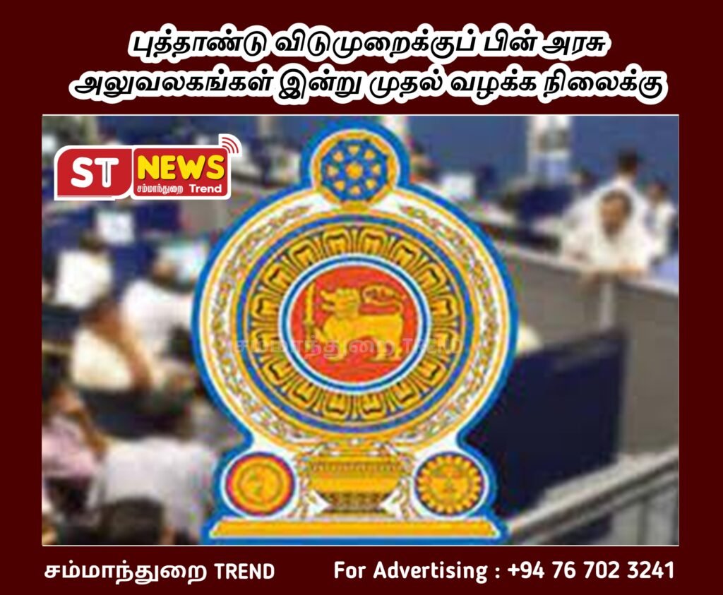 சிங்கள மற்றும் தமிழ் புத்தாண்டு விடுமுறைக்குப் பின்னர், நாடு முழுவதும் உள்ள அரசு நிறுவனங்கள் இன்று (ஏப்ரல் 15) முதல் மீண்டும் இயல்பு நிலைக்கு திரும்பியுள்ளதாக பொது நிர்வாக அமைச்சு அறிவித்துள்ளது.