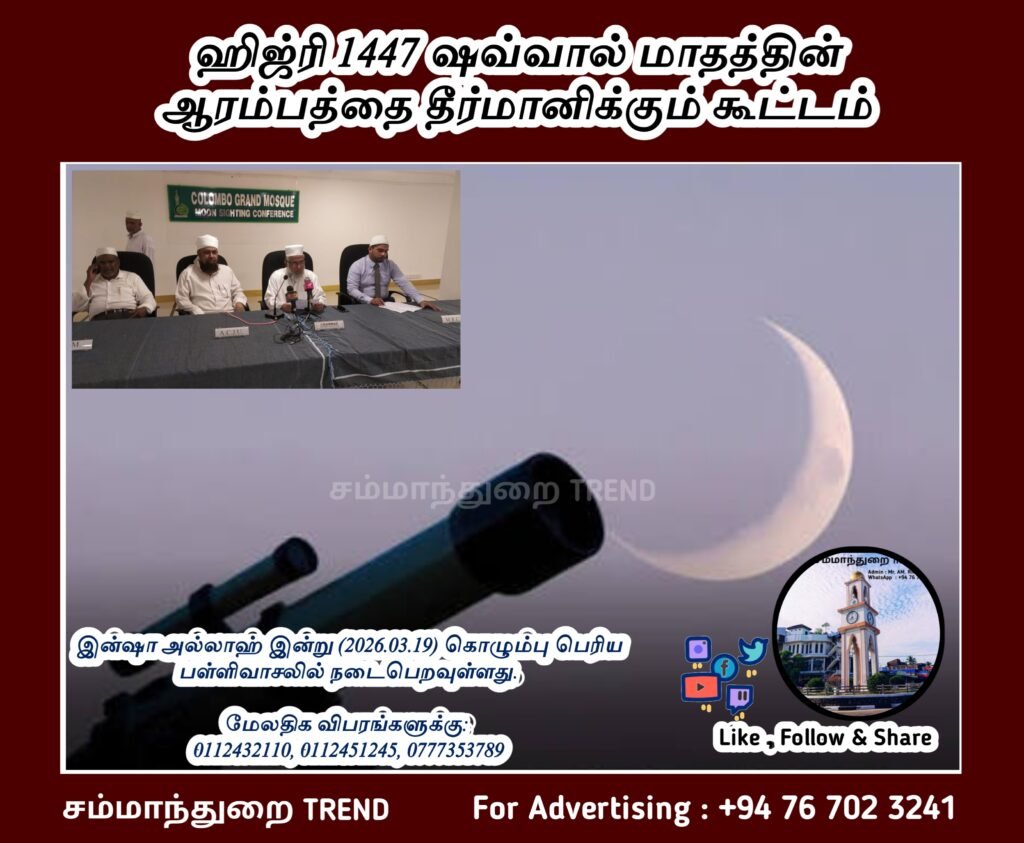 ஹிஜ்ரி 1447 ஷவ்வால் மாதத்தின் ஆரம்பத்தை தீர்மானிக்கும் கூட்டம் இன்ஷா அல்லாஹ் இன்று (2026.03.19) கொழும்பு பெரிய பள்ளிவாசலில் நடைபெறவுள்ளது.