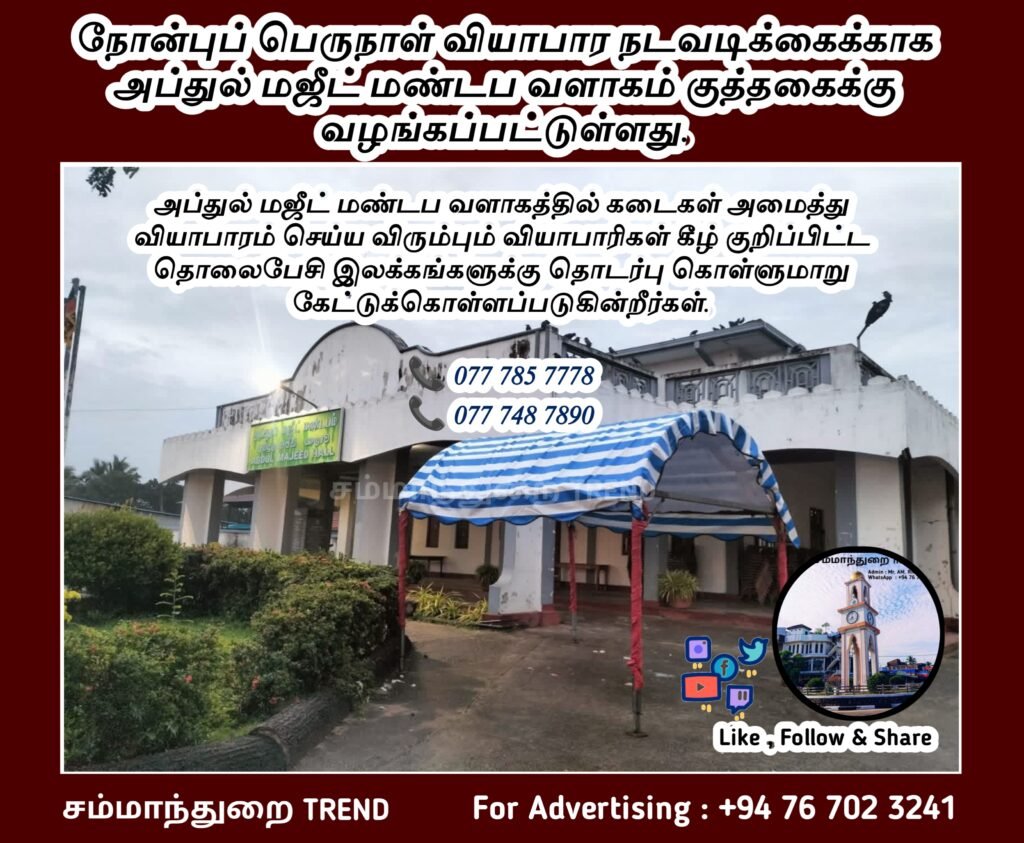 நோன்புப் பெருநாள் வியாபார நடவடிக்கைக்காகஅப்துல் மஜீட் மண்டப வளாகம் குத்தகைக்கு வழங்கப்பட்டுள்ளது. எனவே, அப்துல் மஜீட் மண்டப வளாகத்தில் கடைகள் அமைத்து வியாபாரம் செய்ய விரும்பும் வியாபாரிகள் கீழ் குறிப்பிட்ட தொலைபேசி இலக்கங்களுக்கு தொடர்பு