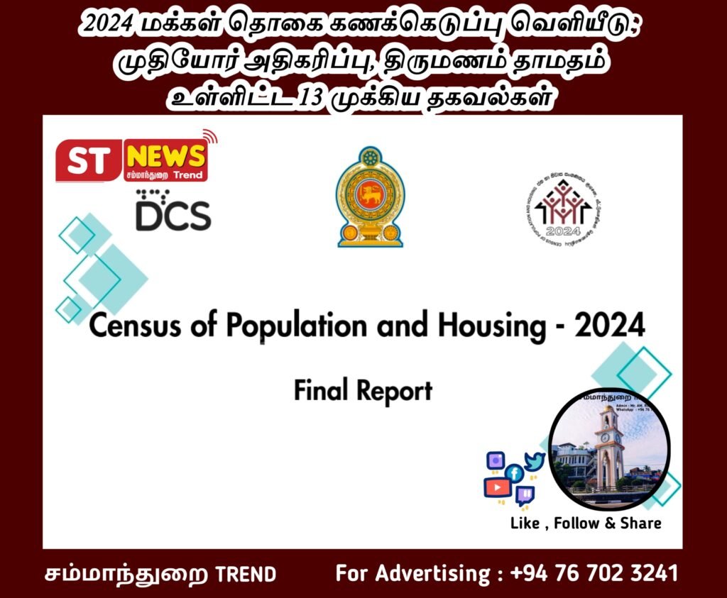 இலங்கையின் மக்கள் தொகை, சமூக மற்றும் பொருளாதார நிலை தொடர்பான முக்கிய தகவல்களை வெளிப்படுத்தும் வகையில், 2024 ஆம் ஆண்டிற்கான மக்கள் தொகை மற்றும் வீடமைப்பு கணக்கெடுப்பு இறுதி அறிக்கை வெளியிடப்பட்டுள்ளது. அறிக்கையின் படி,