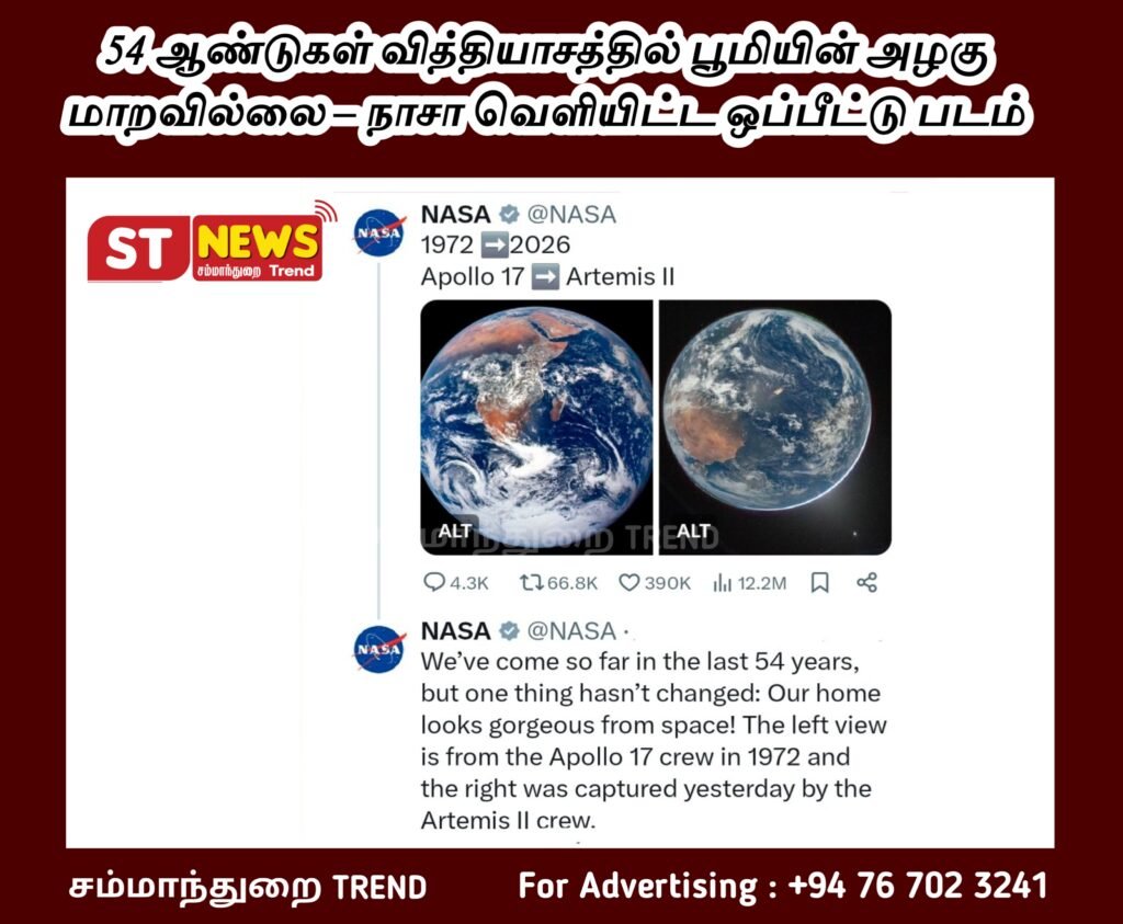 1972 ஆம் ஆண்டு Apollo 17 விண்கலத்திலிருந்து எடுத்த பூமியின் படமும், 2026 ஆம் ஆண்டு Artemis II பயணத்தின் போது எடுக்கப்பட்ட புதிய படமும் ஒப்பிடப்பட்டுள்ளன.
